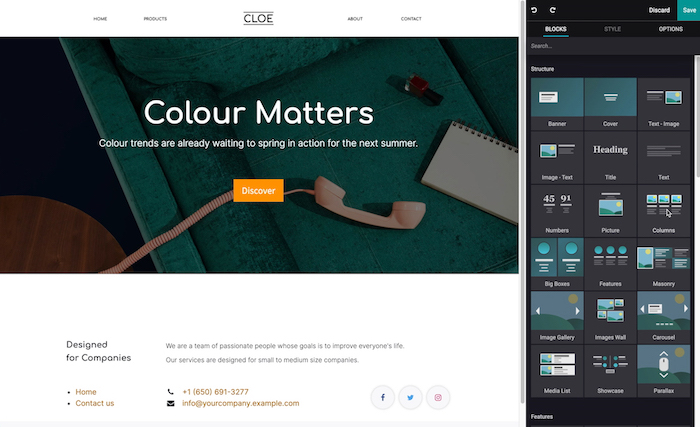 Get smart propositions of design and perfect color combinations with Odoo's Artificial Design Intelligence.